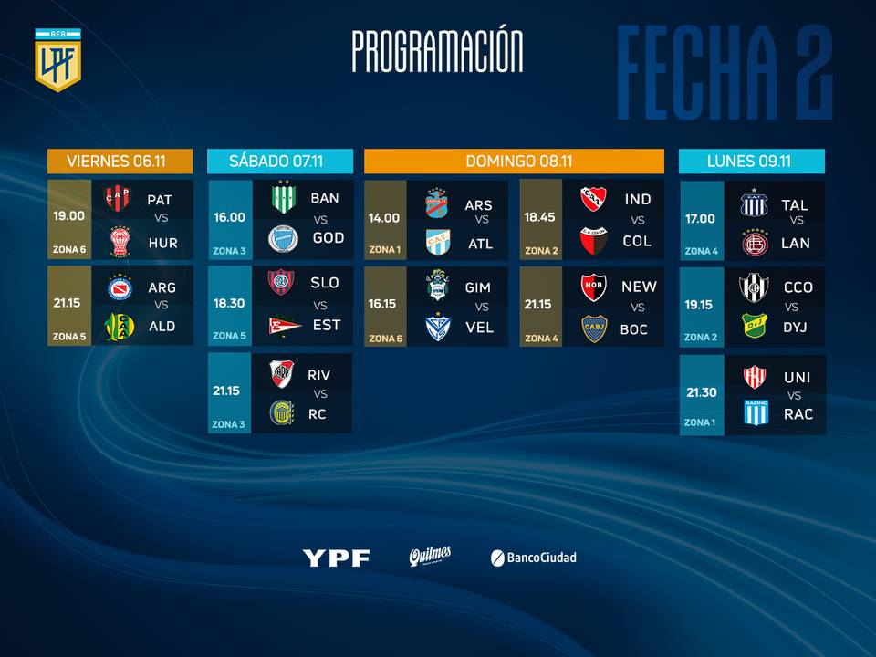 Ya quedaron planificados los días y horarios de la fecha 2 de la Copa: la cual comenzará el viernes 6 de noviembre.