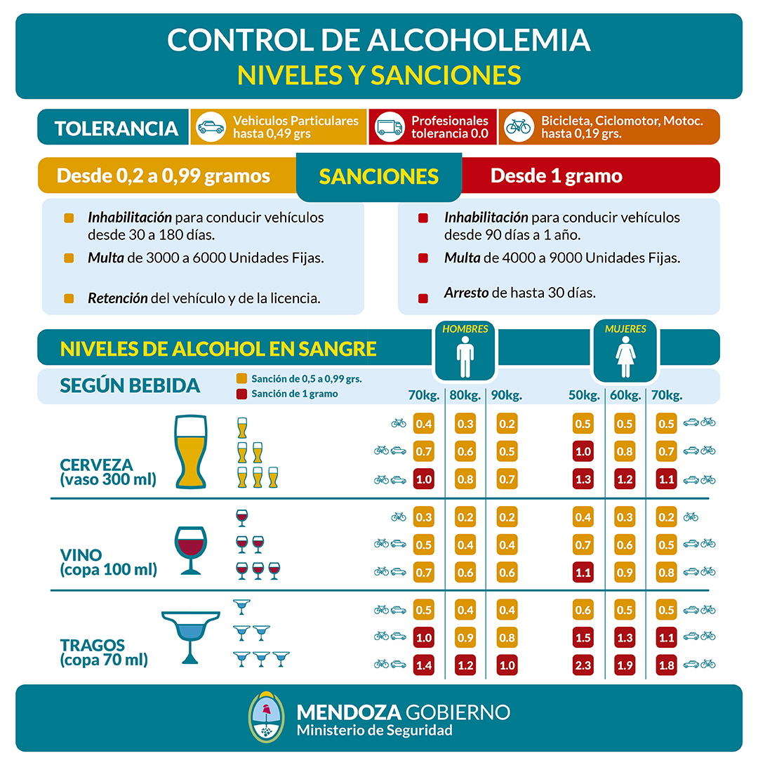 Mientras que con más de 1 gramo de alcohol en sangre, la falta pasa a la órbita contravencional y establece multa de 4 mil a 9 mil Unidades Fijas ($68.000 a $153.000), inhabilitación para conducir vehículos desde 90 a 365 días, retención del rodado y arresto de hasta 30 días.