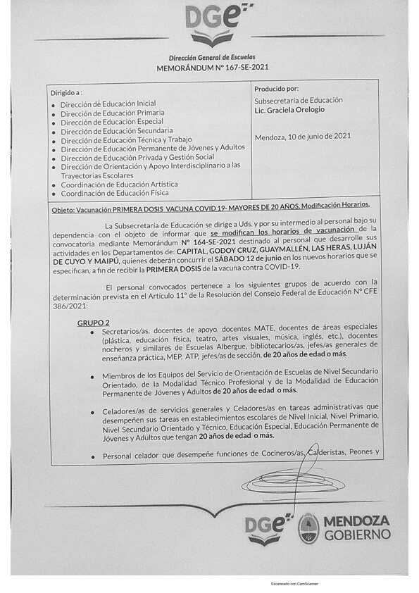 La Dirección General de Escuelas comunica cambios de horarios para la vacunación contra el COVID-19 destinada a personal docente y no docente correspondientes a los grupos 2, 3 y 4 mayores de 20 años que se desarrollará el sábado 12 de junio en el Estadio Aconcagua Arena.