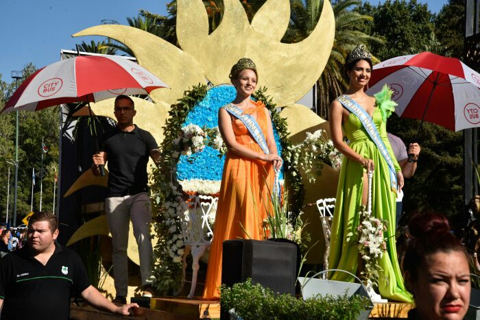 El primer carro trasladaba a las actuales reina y virreina de la Vendimia 2022, Natasha Sánchez y Giuliana Pilot respectivamente. En él estaban representados todos los elementos icónicos de esta provincia: el escudo, el sol, los viñedos y el cóndor, además de la belleza mendocina.