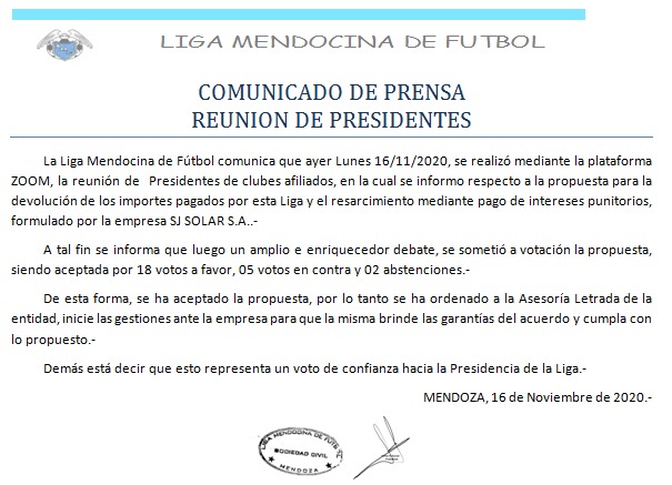 La Liga comunica que los presidentes de los clubes fueron anoticiados de la propuesta manifestada por la empresa SJ SOLAR S.A. La cual era por la devolución de los importes abonados por este ente y el resarcimiento de intereses punitorios.
