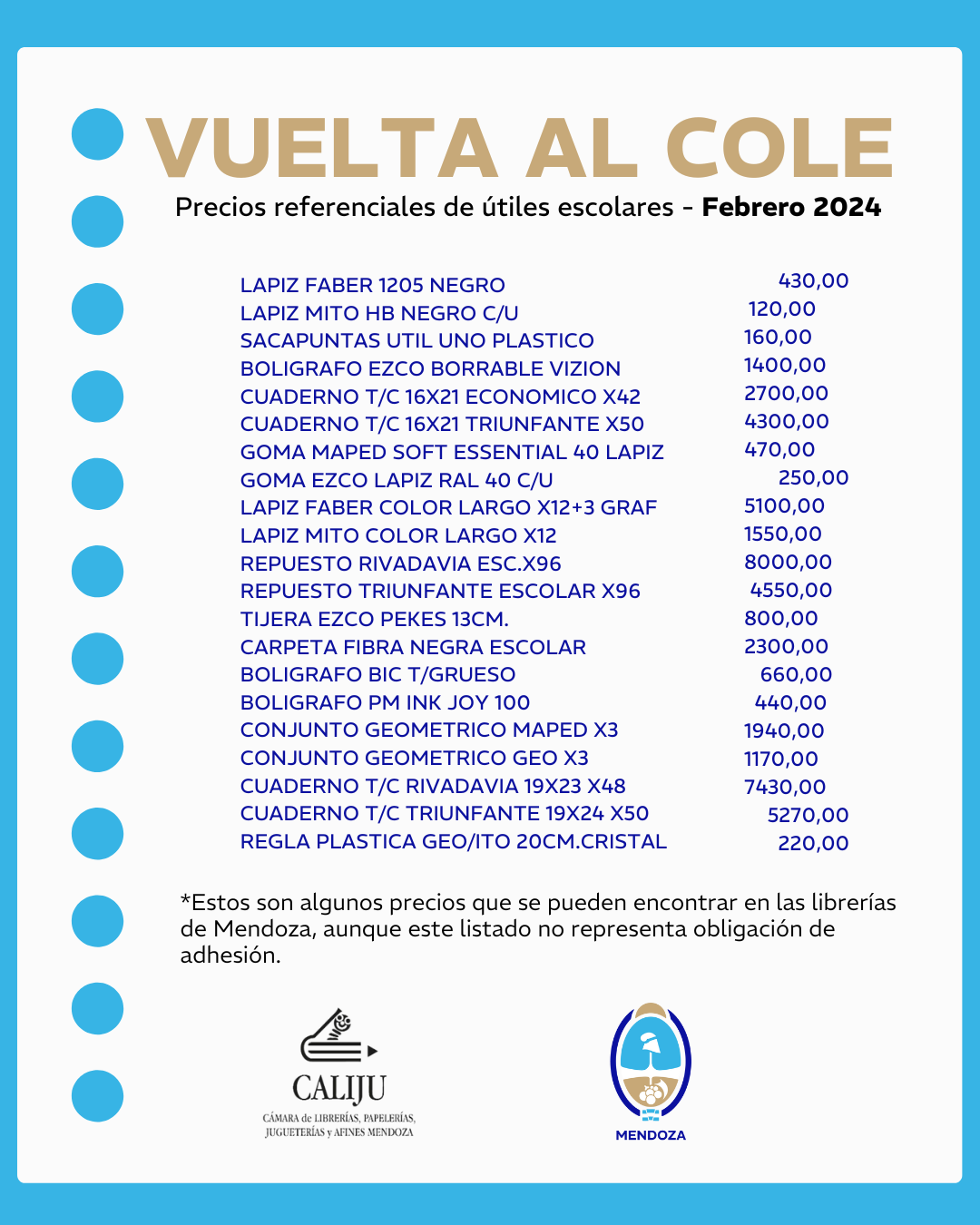 En este encuentro, se elaboró un listado informativo de más de 25 productos de librería escolar, con sus precios de referencia, que se pueden encontrar en las librerías de Mendoza. Este listado no representa obligación de adhesión para los comercios.