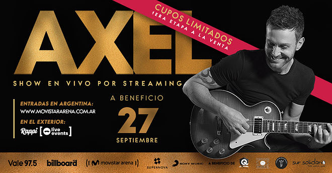 AXEL ofrecerá su primer show vía streaming para todo el mundo desde el Movistar Arena, el venue más importante de Argentina, en el que parte de lo recaudado será a beneficio de grandes iniciativas de las fundaciones y organizaciones Sur Solidario, Baccigalupo, SOS Infantil y el Espacio La Quadra