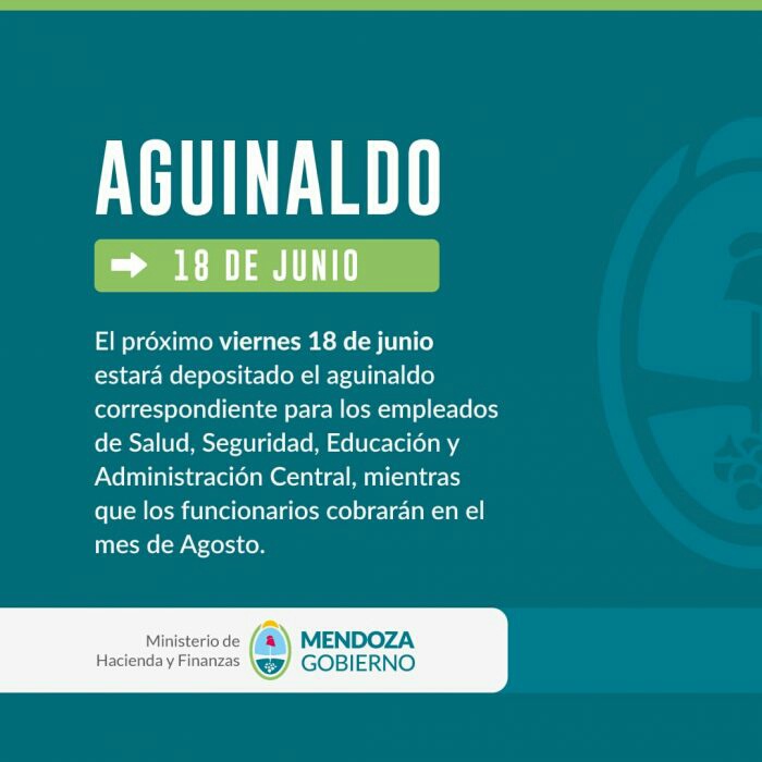El Ministerio de Hacienda y Finanzas de Mendoza informa que el próximo viernes 18 de junio estará depositado el aguinaldo correspondiente a los empleados públicos de la provincia. En tanto, los funcionarios políticos cobrarán en agosto.