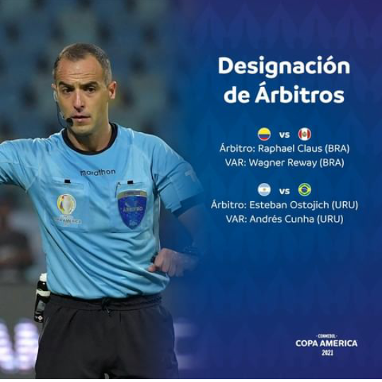 El árbitro designado para la gran final es el uruguayo Esteban Ostojich, de 39 años. Ostojich es juez internacional desde 2016 y ya juzgó a Brasil en esta Copa América, cuando derrotó por 3 a 0 a Venezuela.