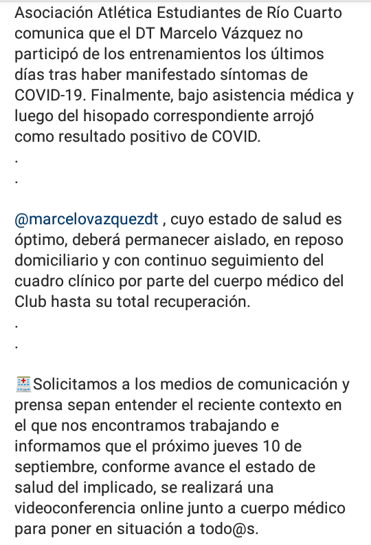 En el escrito oficial que difundió el club en su cuenta de Instagram se señaló que Vázquez "no participó de los entrenamientos los últimos días tras haber manifestado síntomas de COVID-19. Finalmente, bajo asistencia médica y luego del hisopado correspondiente arrojó como resultado positivo de COVID".