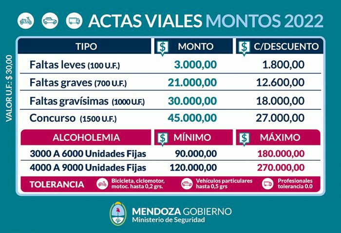 Estos montos rigen desde el 1 de enero de este año, tras el aumento de la Unidad Fija (UF), que pasó de $22 a $30. Si se pagan dentro de los tres días hábiles posteriores a la fecha de realizada el acta vial hay un descuento de 40%.