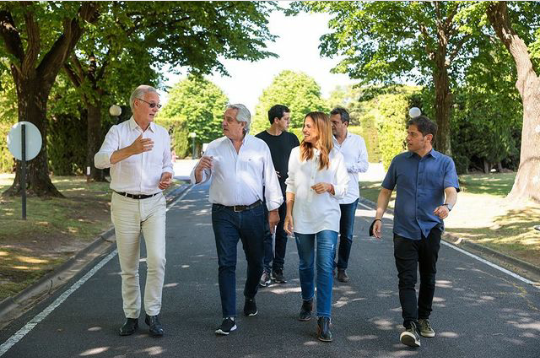 A la residencia presidencial llegaron el gobernador bonaerense Axel Kicillof, el ministro del Interior, Wado de Pedro, y el presidente de la Cámara de Diputados, Sergio Massa, junto con la candidata a diputada por la provincia de Buenos Aires, Victoria Tolosa Paz y el candidato a diputado Daniel Gollán. Se los observa a los referentes bonaerenses en una mesa reunidos en la que ven gráficos y datos relacionados a los comicios.