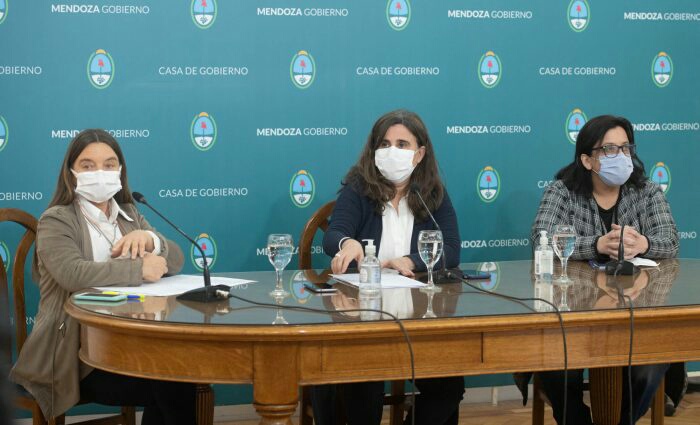 La ministra Ana María Nadal, junto a la subsecretaria de Planificación y Coberturas Públicas Sanitarias, Mariana Álvarez, y la jefa del Departamento de Inmunizaciones, Iris Aguilar, brindaron detalles de la campaña de vacunación en Mendoza. Desde este fin de semana comienza la vacunación para aquellas personas mayores de 60 años que opten, de forma voluntaria, por la combinación de dosis para completar el esquema.