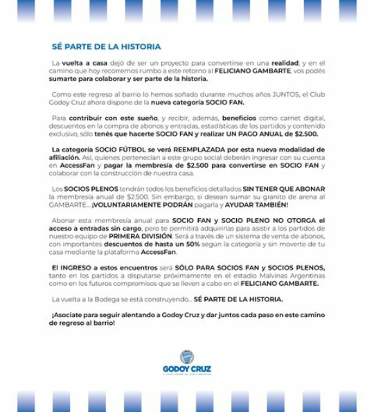 Además, Godoy Cruz advirtió: "Abonar esta membresía anual para SOCIO FAN y SOCIO PLENO NO OTORGA el acceso a entradas sin cargo, pero te permitirá adquirirlas para asistir a los partidos de nuestro equipo de PRIMERA DIVISIÓN. Será a través de un sistema de venta de abonos, con importantes descuentos de hasta un 50% según la categoría y sin moverte de tu casa mediante la plataforma AccessFan".
