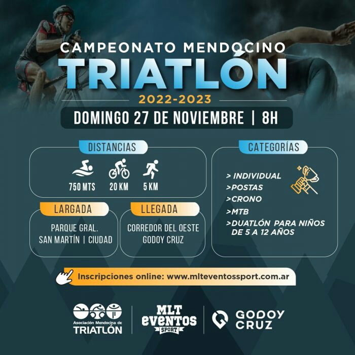 Organizado por la Asociación Mendocina de Triatlón y la Municipalidad de Godoy Cruz, se disputará el domingo 27 de noviembre, a partir de las 8, la segunda edición del Triatlón Godoy Cruz, en el marco de la primera fecha del Circuito Mendocino 2022-2023. Las personas interesadas pueden inscribirse aquí.