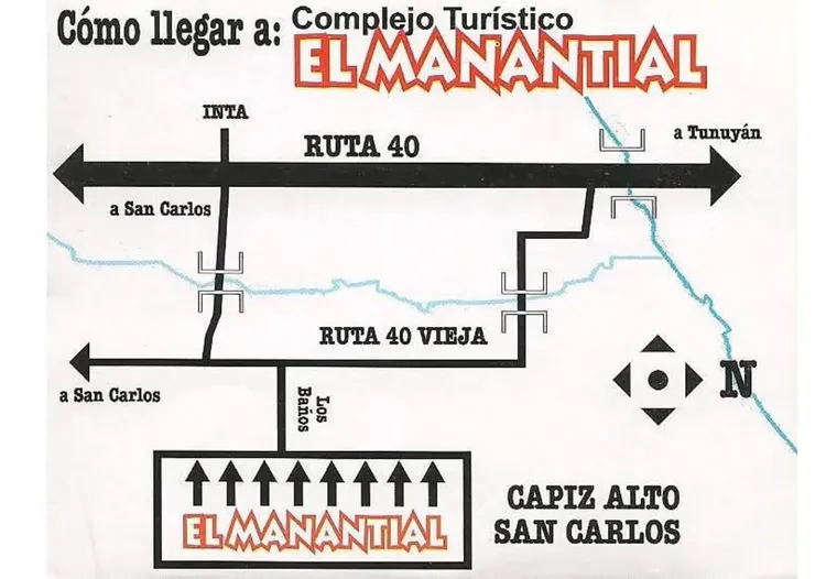 Para llegar al complejo turístico El Manantial desde Mendoza hay que tomar la ruta 40 hacia el sur, cruzar el centro de Tunuyán y girar hacia el este en la primera calle pasando el río Tunuyán. Finalmente, seguir por Carril Nacional hasta Los Baños.