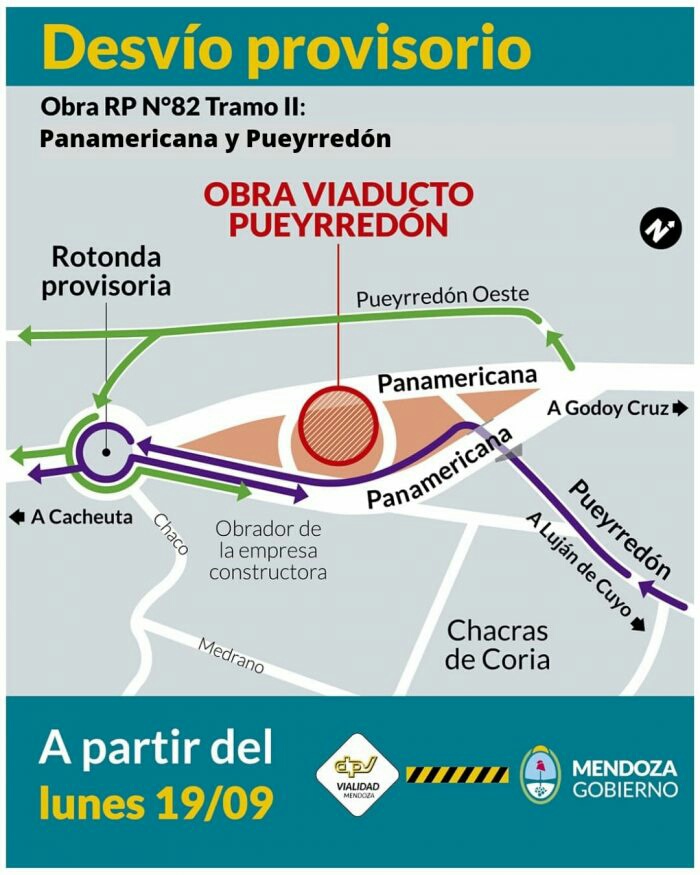Desde este lunes 19 de septiembre, y como parte de las obras en la ruta provincial 82, comenzarán a operar los desvíos provisorios en la rotonda de Panamericana y calle Pueyrredón, en Luján de Cuyo, un importantísimo nudo vial, a través del cual se accede hacia Chacras de Coria al Este y a los barrios de calle La Unión, hacia el Oeste, informó la Dirección Provincial de Vialidad.