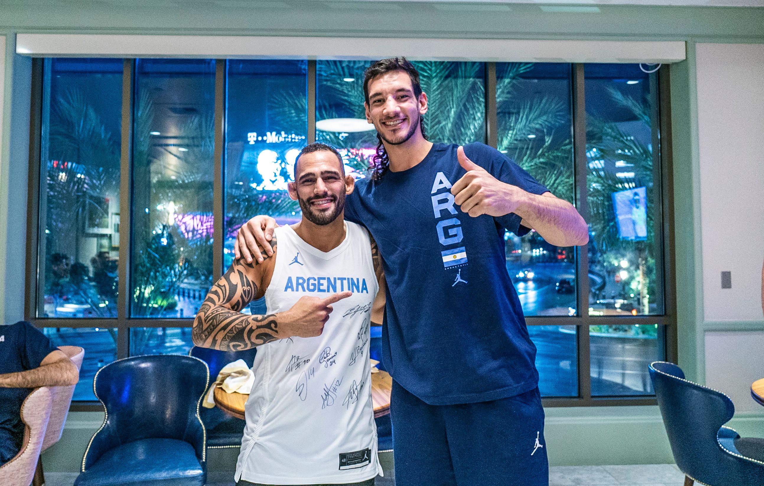 “Nos estamos preparando, pero no tan bien como vos”, le responde Facu Campazzo, quien rápidamente entiende la onda del visitante y toma la voz del grupo, cuando recibe la pregunta de Santi sobre el trabajo del seleccionado en Las Vegas. “¿Vos peleás en la velada?”, consulta el base y el luchador explica por qué no, con una locuacidad que impacta. “Vine a comentar la pelea porque aún me estoy recuperando de la batalla de hace un mes. Fue una guerra, nos matamos… Se dijo, incluso, que fue unas de las mejores peleas del año”, inicia y se mete en los detalles de su triunfo ante Michael Baeza, el 5 de junio, en la velada UFC 28 en Vegas. “Yo comencé a moverme un poco, porque soy bueno en boxeo, vieron, pero me empecé a patinar, el rival me empezó a pegar patadas en las piernas y no podía salir… Cuando terminó el round, tuve que hacer un cambio. Vieron que en el alto rendimiento son segundos, hay que hacerel click… Dejé de moverme y hacerme el técnico, y por dentro dije ‘acá hay que poner los huevos argentinos’. Y bueno, nos matamos a piñas pero ganamos por puntos, 29-28”, relata y así recibe la ovación de todos.