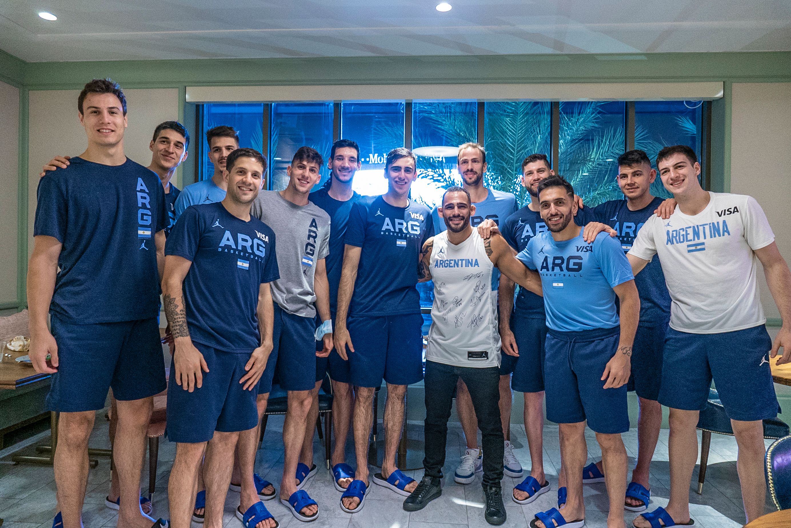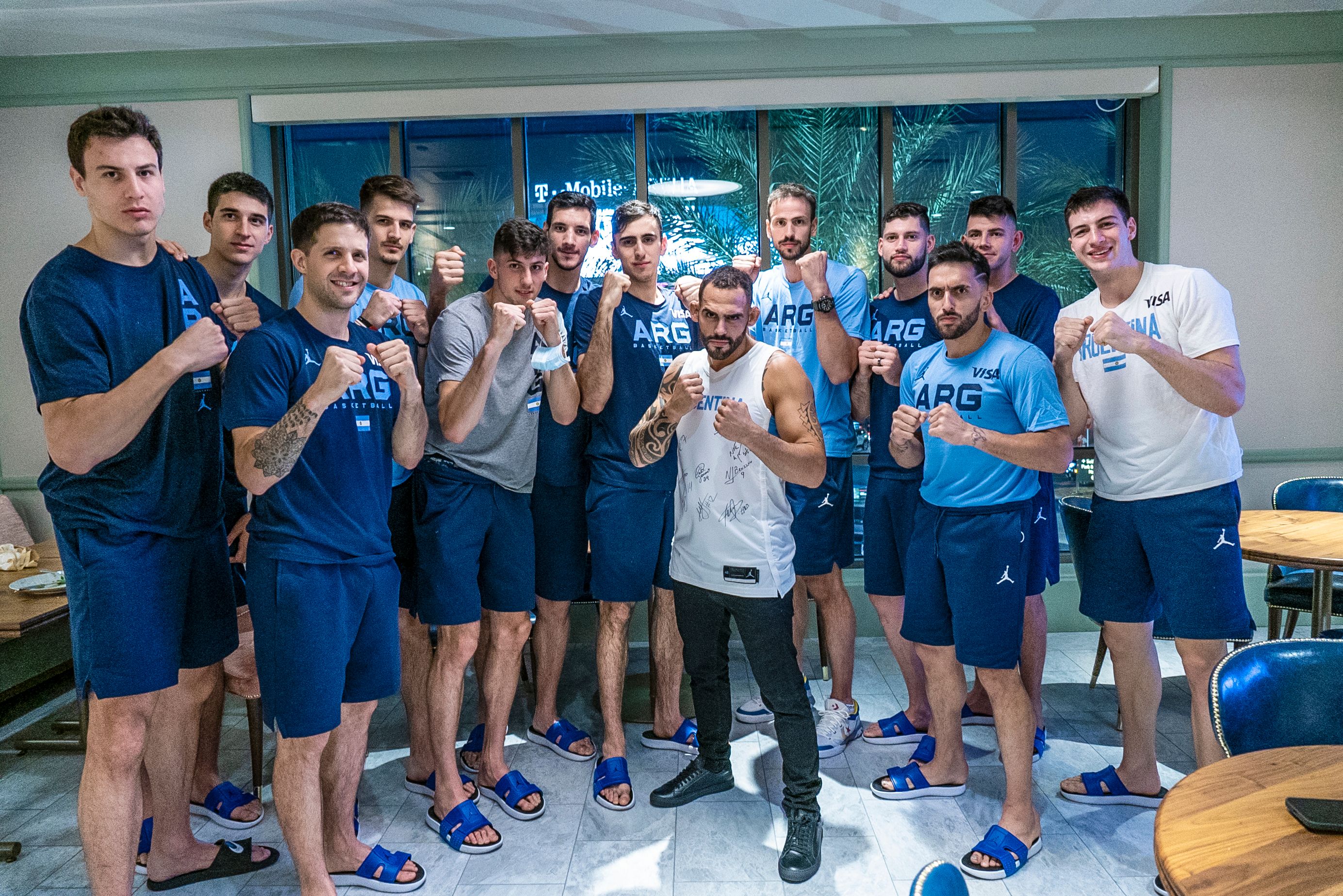 El peleador argentino pasó a saludar por el hotel y armó un show con los jugadores de básquet: preguntas, comentarios, ocurrencias y dos imperdibles cara a cara con Gallizzi y Campazzo. Acá lo mejor del encuentro.