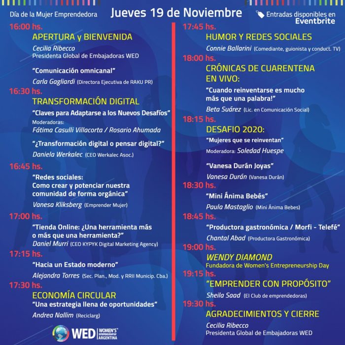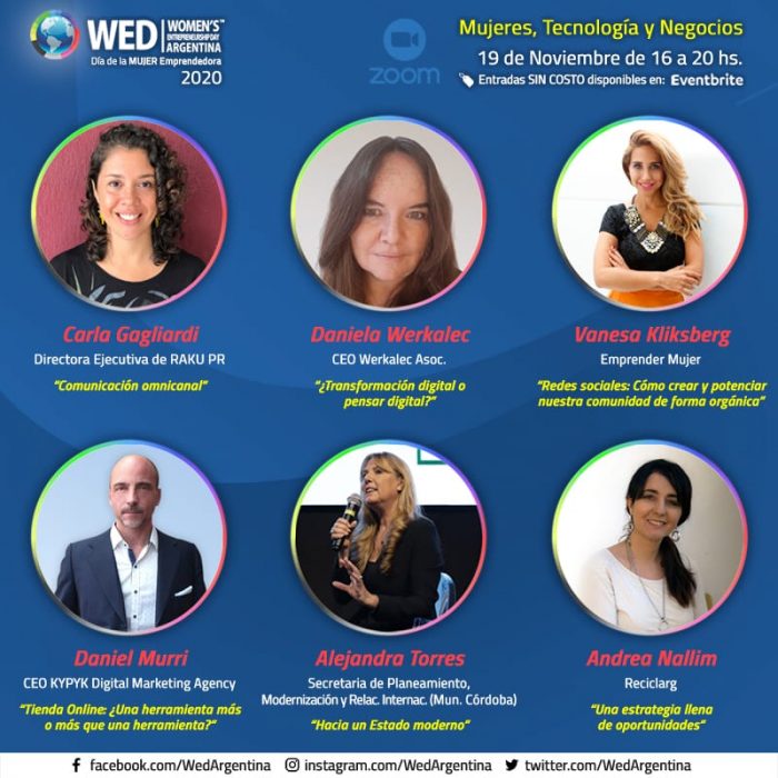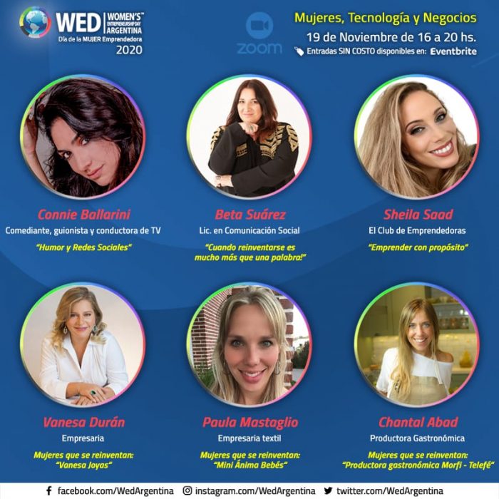 Desde el 2016, los eventos del WED se pudieron disfrutar en diferentes provincias del país. Este año, en el marco de la pandemia, el encuentro será virtual. Por primera vez se realizará bajo el formato online y así, este jueves 19 de noviembre de 2020, de 16 a 20, estará disponible para todas aquellas mujeres que deseen inscribirse aquí.