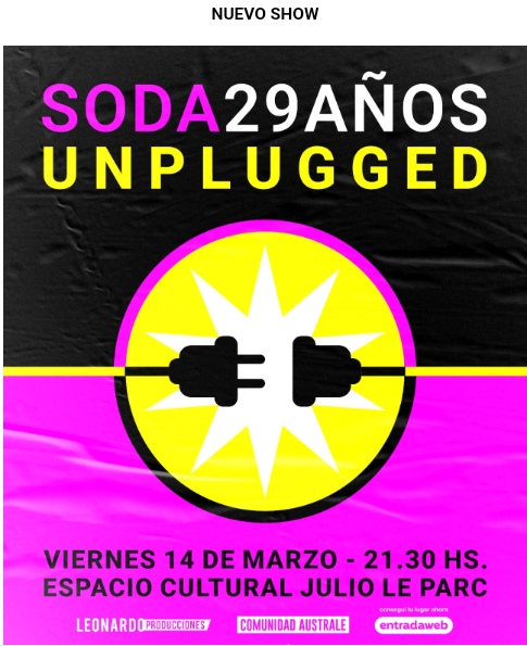 Estrena un concierto homenaje a uno de los discos más emblemáticos de Soda Stereo. El próximo 14 de marzo sonará Soda Unplugged: 29 Años, un show que repasa y recrea el memorable registro de una de las bandas más importantes del rock nacional. La cita es el Espacio Julio Le Parc y las entradas están disponibles en Entradaweb.com.ar y boletería del espacio.