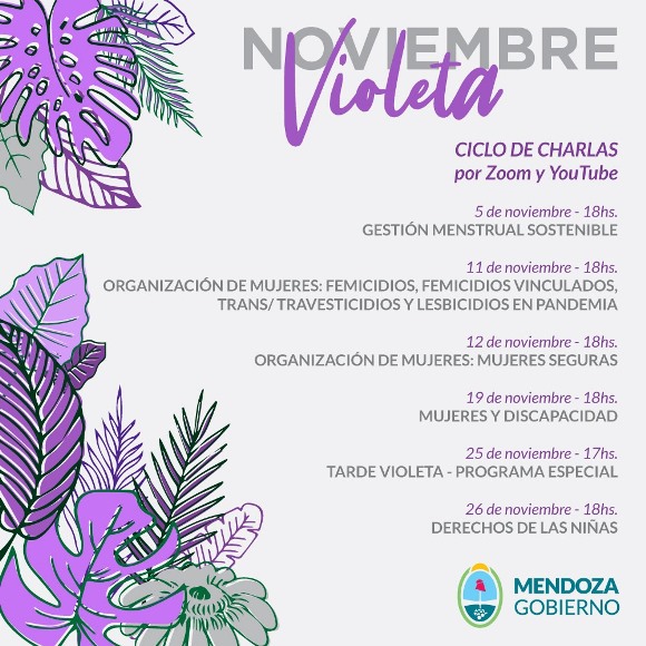 Ciclo de charlas: “Noviembre violeta. Este ciclo pretende sumar contenido para seguir haciendo de este un mes de reflexión. Será transmitido, todas las semanas de noviembre, por el canal de YouTube de la Dirección Provincial de Juventudes.