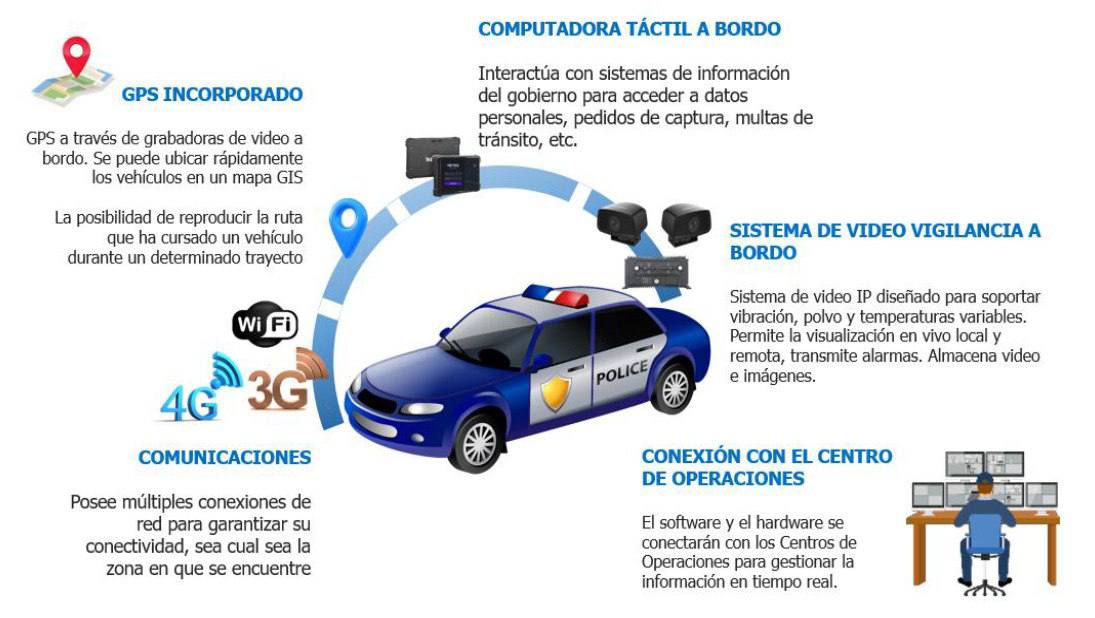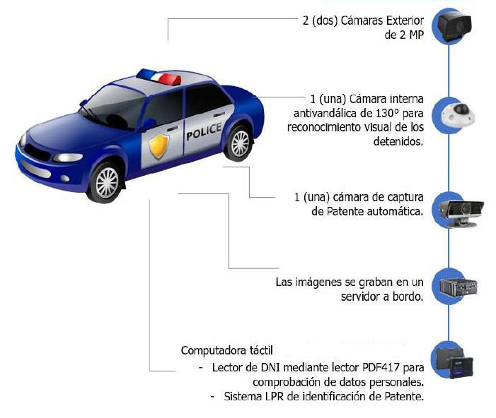 Unos 200 móviles policiales tendrán cámaras de videovigilancia y computadora a bordo. Dentro del proyecto adjudicado se implementará, en un porcentaje de patrullas, la integración del sistema de videovigilancia móvil con la lectura automática de patentes.