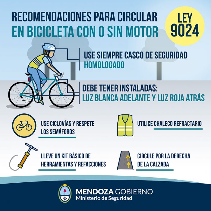 Según la Ley de Seguridad Vial 9024, en su artículo 44, establece que para circular en bicicleta, con o sin motor, es obligatorio que sus conductores y ocupantes usen cascos de seguridad homologados y llevan instalada en la parte delantera una luz blanca y otra roja atrás.