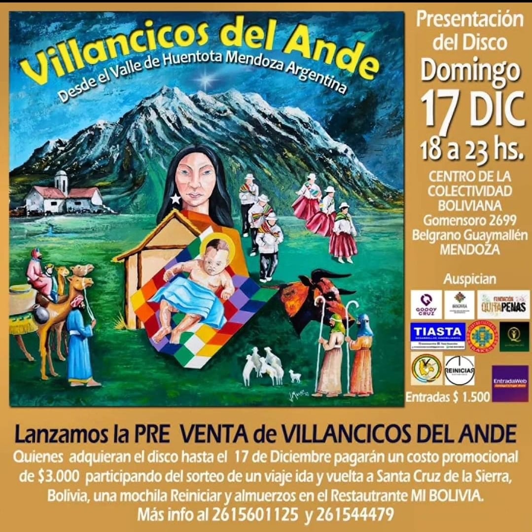 La presentación oficial de Villancicos del Ande" se llevará a cabo el Domingo 17 de Diciembre de 18 a 23 hs. en el Centro de la Colectividad Boliviana de Guaymallén 🇧🇴, ubicado en Gomensoro 2699, Belgrano, Guaymallén. ¡Prepárate para un espectáculo lleno de danzas, música y la calidez de nuestras tradiciones! No te pierdas la oportunidad de disfrutar de una feria de comidas y artesanías, una experiencia que te sumergirá en la cultura andina.