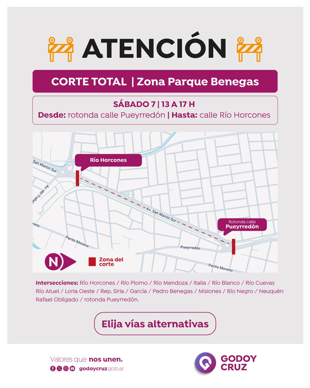 Allí, en la calle San Martín Sur, la interrupción de la circulación será el 7 de junio, desde las 13 hasta las 17. Entonces, el corte será desde la rotonda Pueyrredón hasta la calle Rio Horcones.