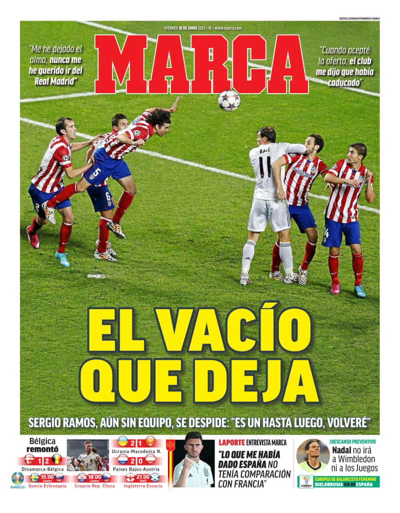 Esta tremenda tapa de Marca utilizó la elipsis escrita/visual para referirse a la despedida de Sergio Ramos sin necesidad de nombrarlo. Allí, en ese hueco, el gran defensor saltó de manera acrobática para conectar el lanzamiento de corner -ejecutado por Modric- y vencer a Courtois a los 93' en la final de Champions 2013/2014, que le dió la Décima al Real Madrid (4-1). Seis meses después, otro cabezazo -corner de Kroos- superó a Torrico en el 2-0 sobre San Lorenzo en la final del Mundial de Clubes 2014.