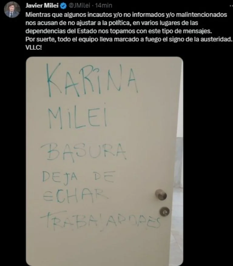El presidente Javier Milei rechazó el mensaje que dejaron contra su hermana, Karina Milei, en una de las entidades del Estado donde se ha ajustado la planta de personal.