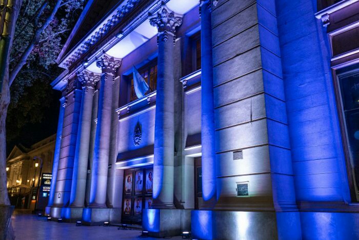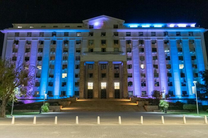 Las fachadas de estos edificios públicos provinciales y municipales lucen los colores azul y blanco de la bandera de Israel, abrazando en este difícil momento a toda su comunidad: