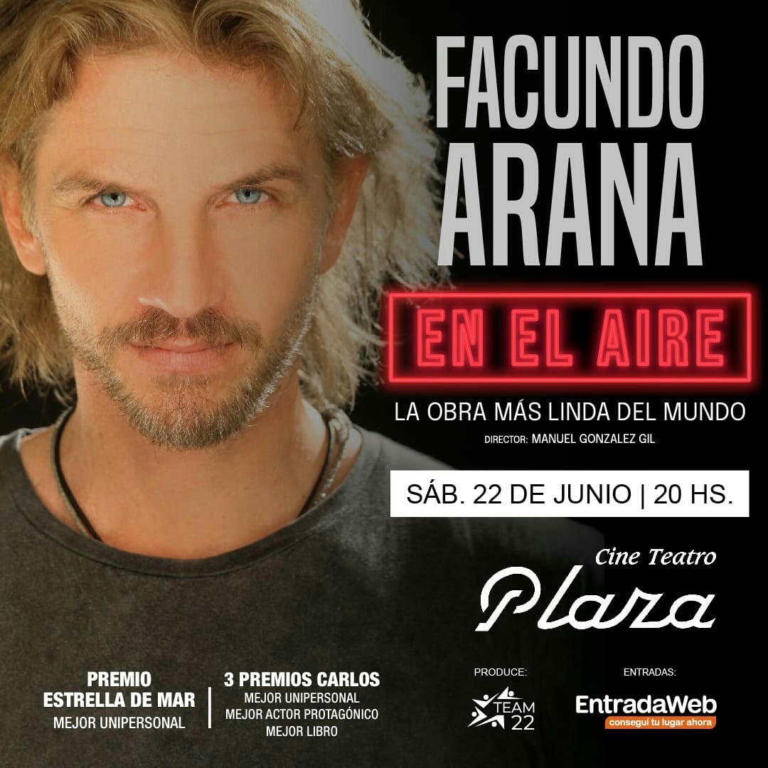 Facundo Arana vuelve a Mendoza con su unipersonal "En el Aire". Ofrecerá una única función de la multi premiada obra, el sábado 22 de junio, en el Teatro Plaza. La preventa de entradas con descuento está disponible en Entradaweb.com.ar y boletería del Teatro.