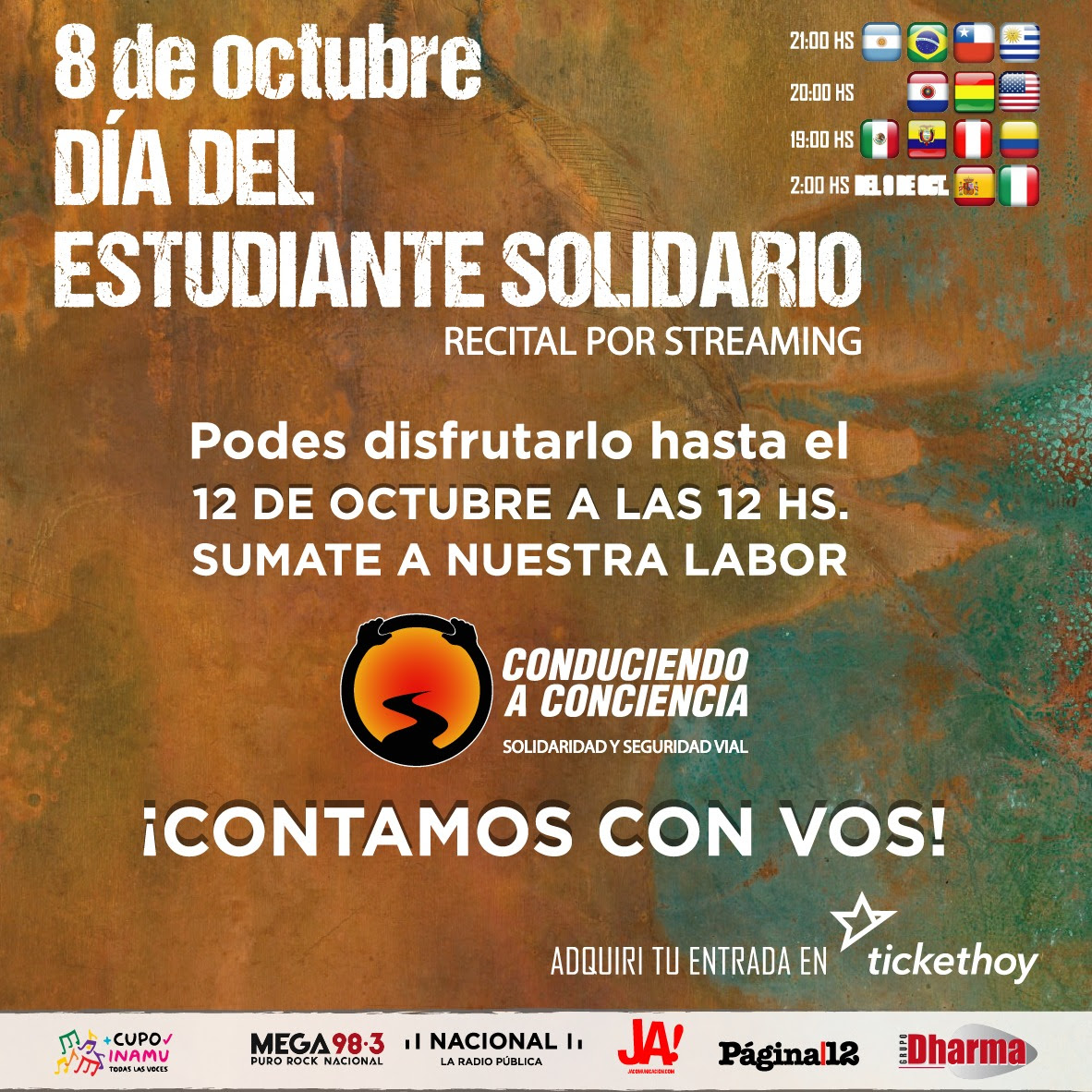 La Asociación Conduciendo a Conciencia, que presentó su recital 8 DE OCTUBRE, DÍA DEL ESTUDIANTE SOLIDARIO en la Plataforma TicketHoy, anuncia que el evento permanecerá en la modalidad “streaming/on-demand” hasta el día LUNES 12 de OCTUBRE a las 12:00 PM.