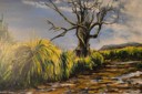 En tanto, las obras de Osvaldo Oliva abordan el paisaje desde la ausencia de la figura humana, aunque su huella permanece insinuada en caminos y marcas sobre el territorio. Sus pinturas trabajan la distancia, la escala y el silencio, proponiendo una experiencia contemplativa en la que el entorno adquiere una presencia autónoma.