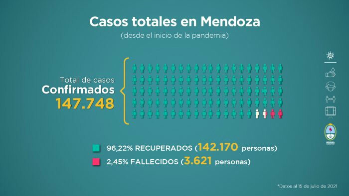 Los primeros datos que se desprenden desde que comenzó la pandemia en Mendoza son hasta anoche a las 21.30: 147.748 confirmados, 142.170 recuperados y 3.621 fallecidos.