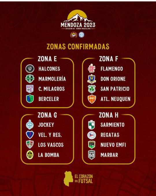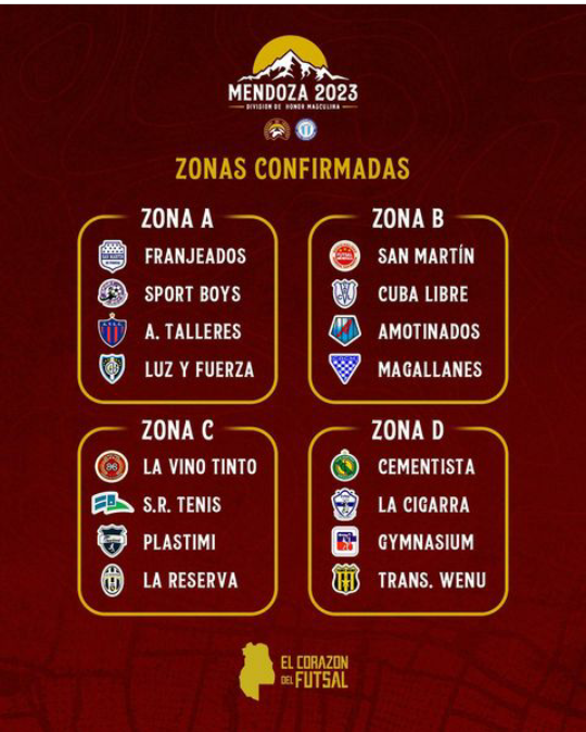 El grupo "C" estará compuesto por San Rafael Tenis Club, elenco del sur mendocino, La Vino Tinto (Chubut), Plastimi (Posadas) y La Reserva (Santa Cruz). La zona "D" tiene como gran protagonista a Cementista, que deberá medirse frente a La Cigarra (Comodoro Rivadavia), Gymnasium (Tucumán) y Transporte Wenu (Esquel). La zona "E" es la única que no tiene equipos mendocinos y estará integrada por Halcones (Comodoro Rivadavia), Marmolería (Corrientes), Cruz Milagro (Corrientes) y Berceler (Santa Cruz)