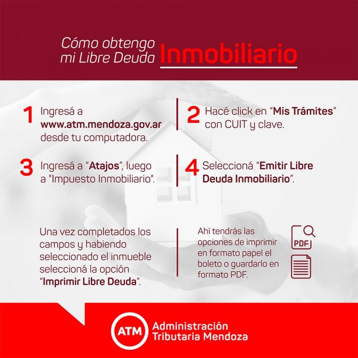 La Administración Tributaria Mendoza (ATM) informó a los contribuyentes que dentro del aplicativo de autogestión “Mis Trámites”, en www.atm.mendoza.gov.ar, se puede obtener libre deuda de Impuestos Patrimoniales de manera simple.