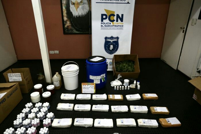 En total, se detuvieron a 7 personas y se decomisaron 19 kilos de cocaína, plantas de marihuana, armas y dinero, entre otros elementos para el estiramiento de la sustancia.