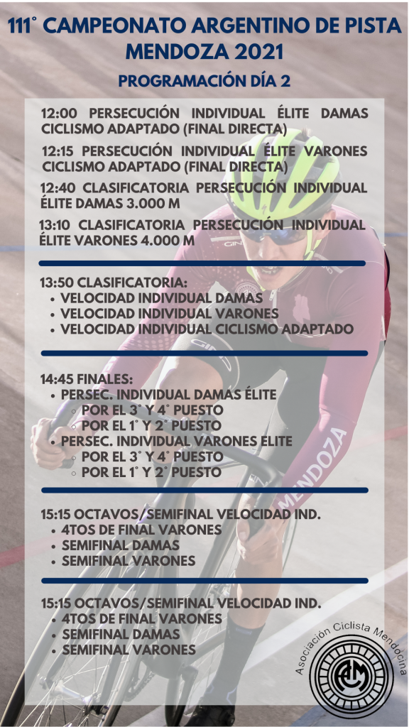 La Asociación Ciclista Mendocina dio comienzo este jueves al 111° Campeonato Argentino de ciclismo de pista en el Velódromo Provincial Ernesto Contreras. Los mejores ciclistas del país se reúnen en el Parque General. San Martín hasta el domingo 17 de octubre, en competencia que tiene el apoyo del Gobierno de Mendoza, a través de la Subsecretaría de Deportes.