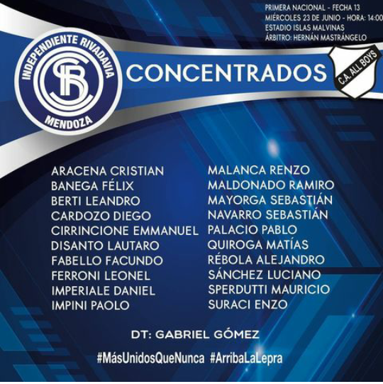 Gabriel Gómez, no tocará el equipo, para jugar este miércoles a las 14 en Floresta ante All Boys. Este compromiso es por la fecha 13 de la Zona B del torneo de la Primera Nacional. La Lepra está segundo en la Zona B, a dos puntos del puntero Güemes de Santiago del Estero.