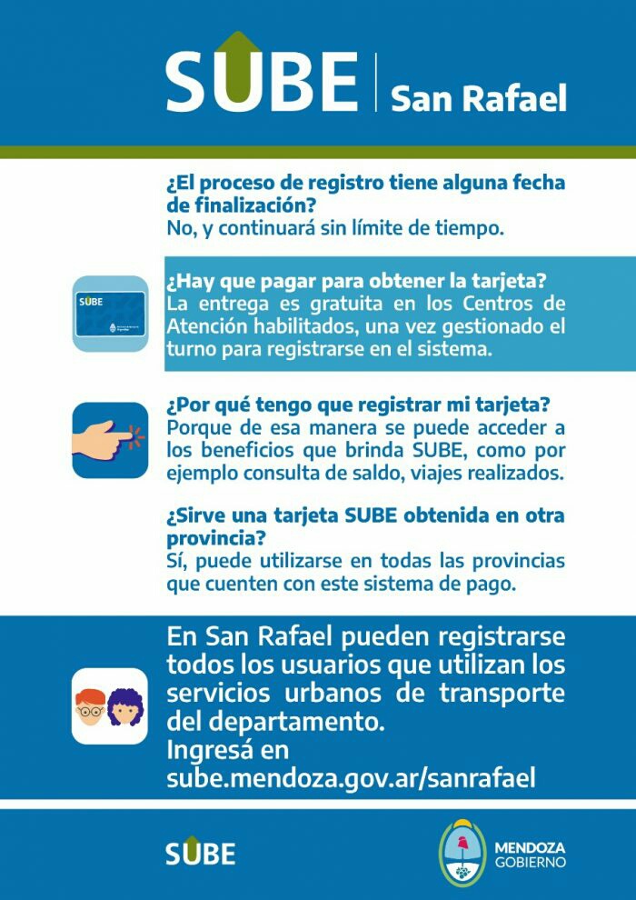 ¿Hay que pagar para obtener la tarjeta? La entrega es gratuita en los centros de atención que estarán habilitados, una vez gestionado el turno para registrarse en el sistema. Los puntos serán: Terminal de Ómnibus de San Rafael, boleterías de las empresas Iselín y Buttini, Unidad de Gestión SUBE San Rafael ubicada en calle 25 de Mayo 67, Centro de Atención de Buttini en calle Corrientes y Av. 9 de Julio, Cetro de Atención Iselín en Galería Unishop ubicada en Av. Yrigoyen y Av. San Martín.