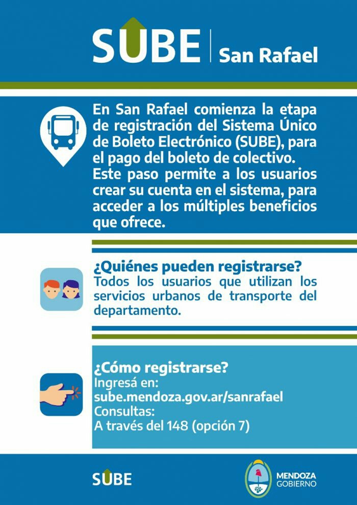 Es importante destacar que en San Rafael pueden registrarse, a partir del 30 de junio, todos los usuarios que utilizan servicios urbanos de transporte del departamento, ingresando en sube.mendoza.gov.ar/sanrafael