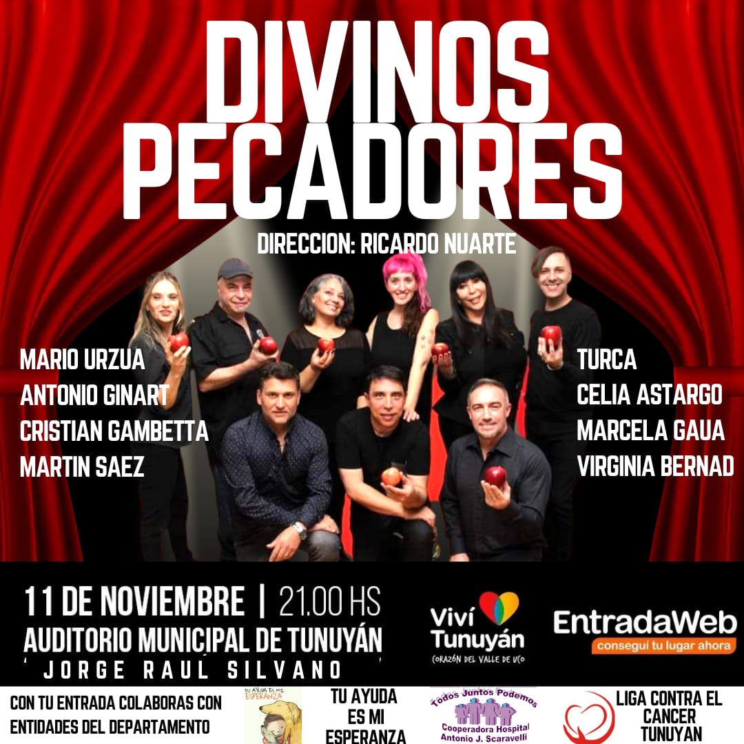 Con el auspicio del Municipio de Tunuyán , el viernes 11 de noviembre a las 21 horas llega al Auditorio Jorge Raúl Silvano la Obra “Divinos Pecadores”.