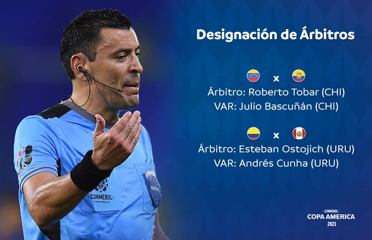 Los partidos que darán comienzo a la 3° fecha de la CONMEBOL Copa América 2021 por el Grupo B el próximo domingo ya tienen sus árbitros confirmados. En primer lugar, el encuentro que enfrentará a Venezuela ante Ecuador, que se jugará en el Estadio Nilton Santos de Río de Janeiro, tendrá como árbitro principal al chileno Roberto Tobar. Su compatriota Julio Bascuñán estará a cargo del VAR. Más tarde, en el Estadio Olímpico de Goiania, Perú jugará frente a Colombia y dicho encuentro tendrá el arbitraje del uruguayo Esteban Ostojich, con su compatriota Andrés Cunha a cargo del VAR. Cabe destacar que será el segundo partido de Ostojich en esta CONMEBOL Copa América, ya que también dirigió el encuentro inaugural del certamen entre Brasil y Venezuela.