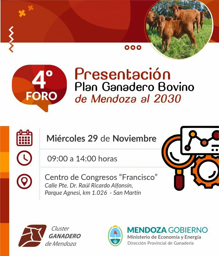 El Ministerio de Economía y Energía, a través de la Dirección de Ganadería, en conjunto con el Clúster Ganadero Mendoza, invita a participar en una nueva edición del Foro Plan Ganadero Bobino de Mendoza al 2030.