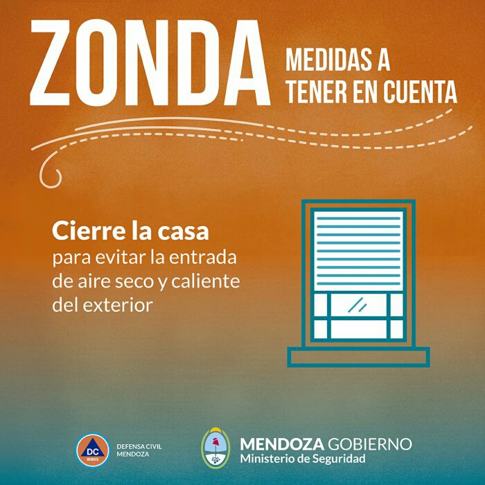 – Ser precavido en lugares descubiertos. Por momentos, las fuertes ráfagas del viento Zonda pueden arrancar chapas, tejas u otros objetos de los techos y ser arrojados con fuerza a grandes distancias.