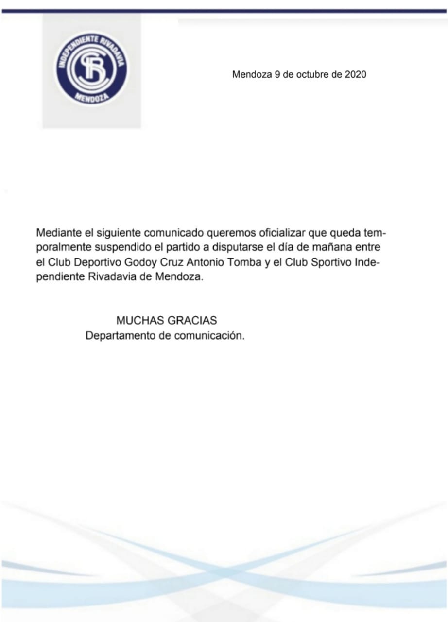 El amistoso que tenían pactado los clubes de Godoy Cruz e Independiente Rivadavia fue al final suspendido para cortar choques de hinchas de ambas entidades, a pesar de que el juego estaba armado en el predio Coquimbito, a puertas cerradas.