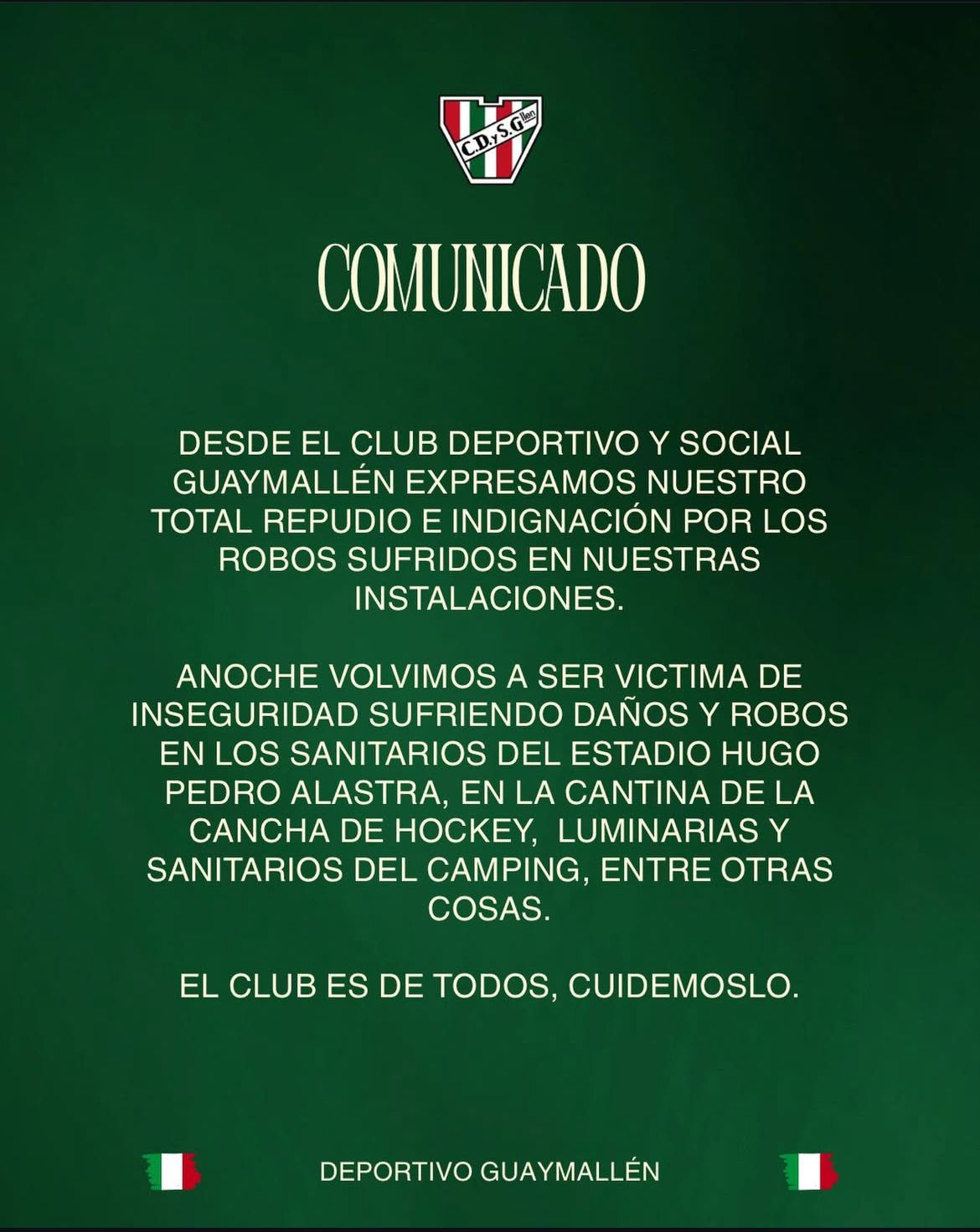 El Club Guaymallén, que disputa la Liga Mendocina de Fútbol, comunicó a través de sus redes sociales el repudio ante los robos sufridos en sus instalaciones.
