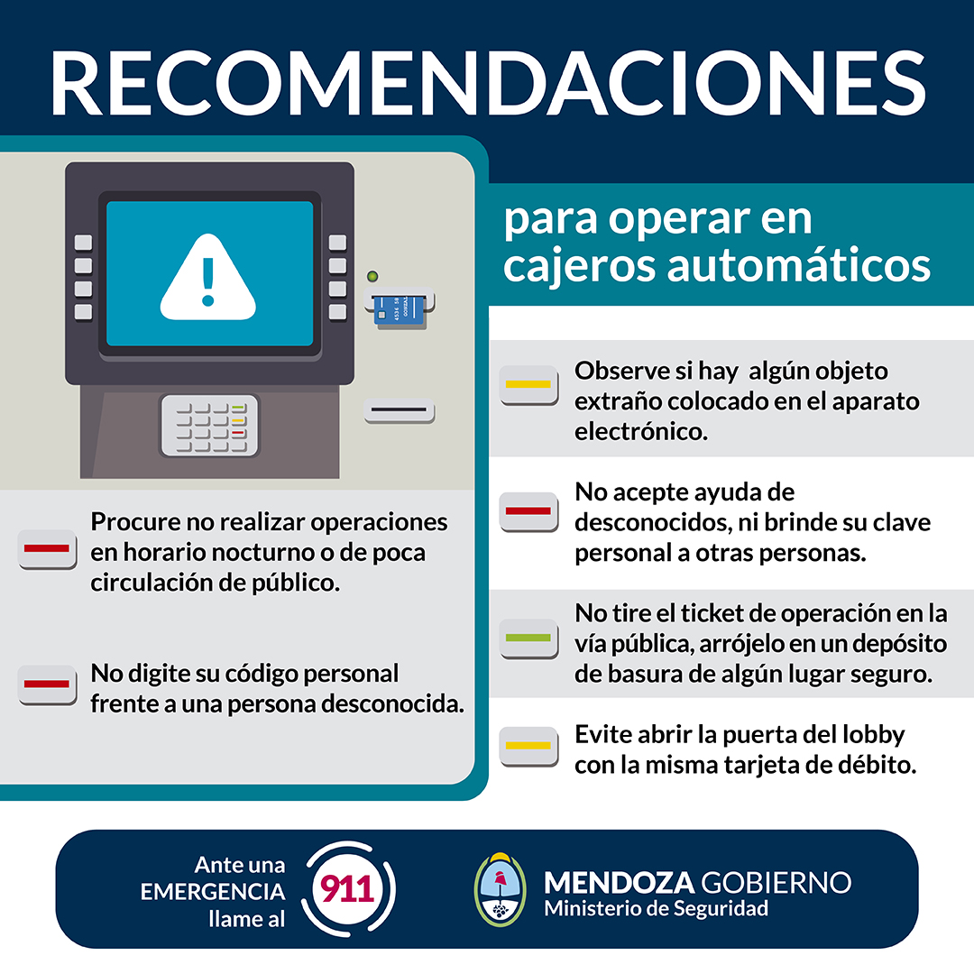 No operar en ningún cajero automático si se observa algún objeto extraño colocado en el aparato electrónico.Observar los detalles y utilizar otro plástico para abrir la puerta principal del cajero, para que no queden los datos en ese sector, fácilmente captables por cualquier clonador de tarjetas.Usar los cajeros donde concurran mayor cantidad de personas, evitando realizar operaciones en los aparatos electrónicos en horarios nocturnos. De lo contrario, buscar aquellos bancos que se ubican en una zona iluminada y segura.No aceptar ayuda de extraños.Estar atento a los alrededores del banco.No abrir la cartera o billetera mientras se encuentre en el interior de la entidad bancaria, ya que alguna persona desconocida puede estar observando dicha situación.Ante situaciones sospechosas hay que comunicarse de forma inmediata al 911.