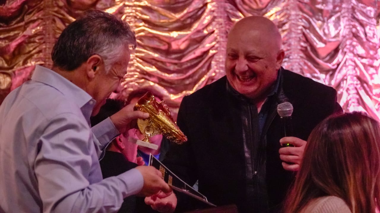 Acto seguido le dio la bienvenida a Alfredo Cornejo a quien invitó a subir al escenario y galardonó con un peculiar Botín de Oro en reconocimiento a los 40 goles en una temporada que el actual Senador Nacional afirma ostentar como futbolista en la Liga de Eugenio Bustos.