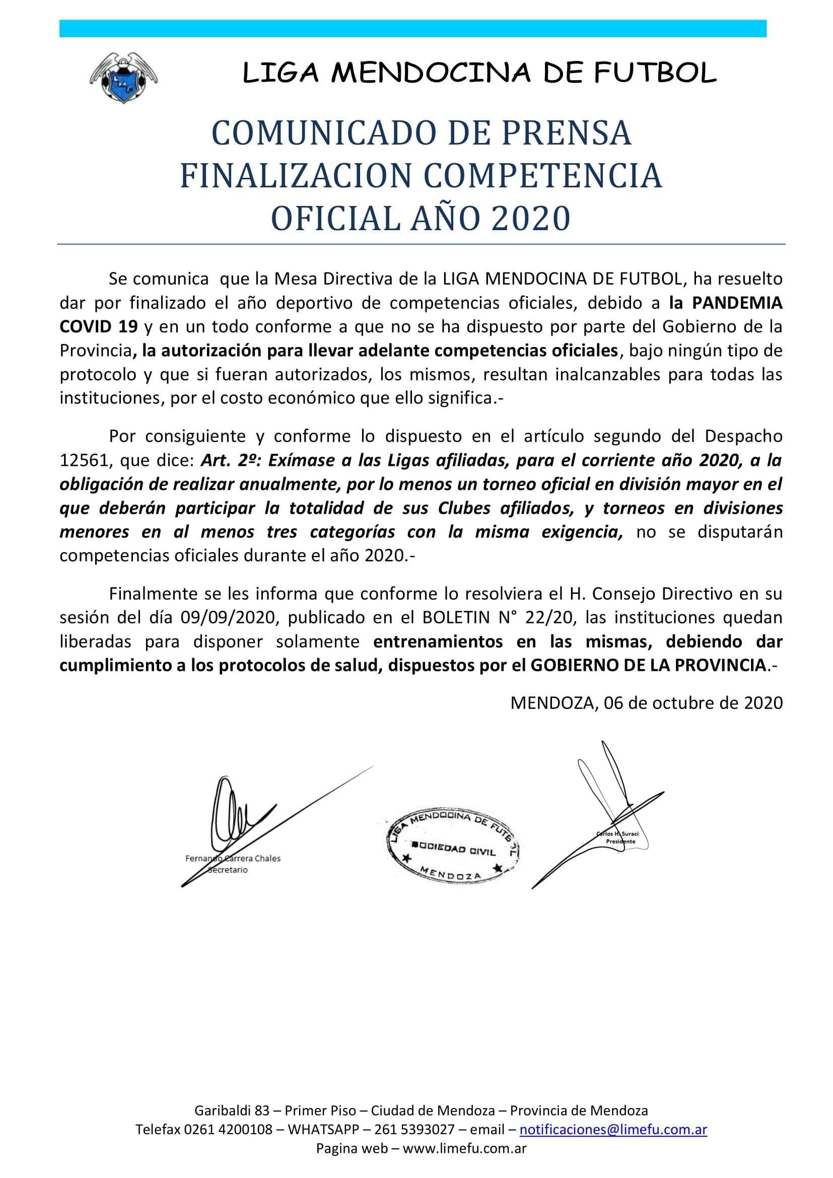 La Liga Mendicina de Fútbol ha resuelto detener el año futbolístico de sus clubes debido a la pandemia. Y si el gobierno local decidiera liberar la actividad con los protocolos, la Liga tampoco autorizaría el fútbol por el costo que demandaria.
