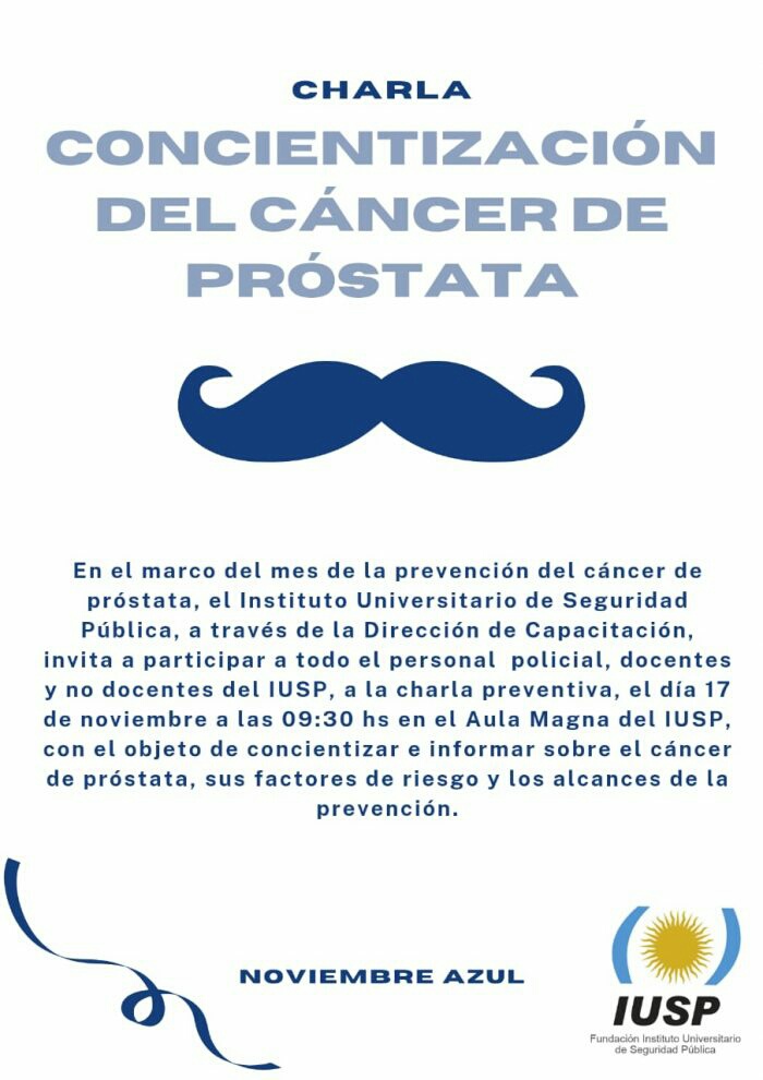 En el marco del Noviembre Azul, el Instituto Universitario de Seguridad Pública (IUSP) realizará una Jornada de Concientización del Cáncer de Próstata. Se tratará de una charla preventiva, con el objeto de concientizar e informar sobre la enfermedad, sus factores de riesgo y los alcances de prevención.